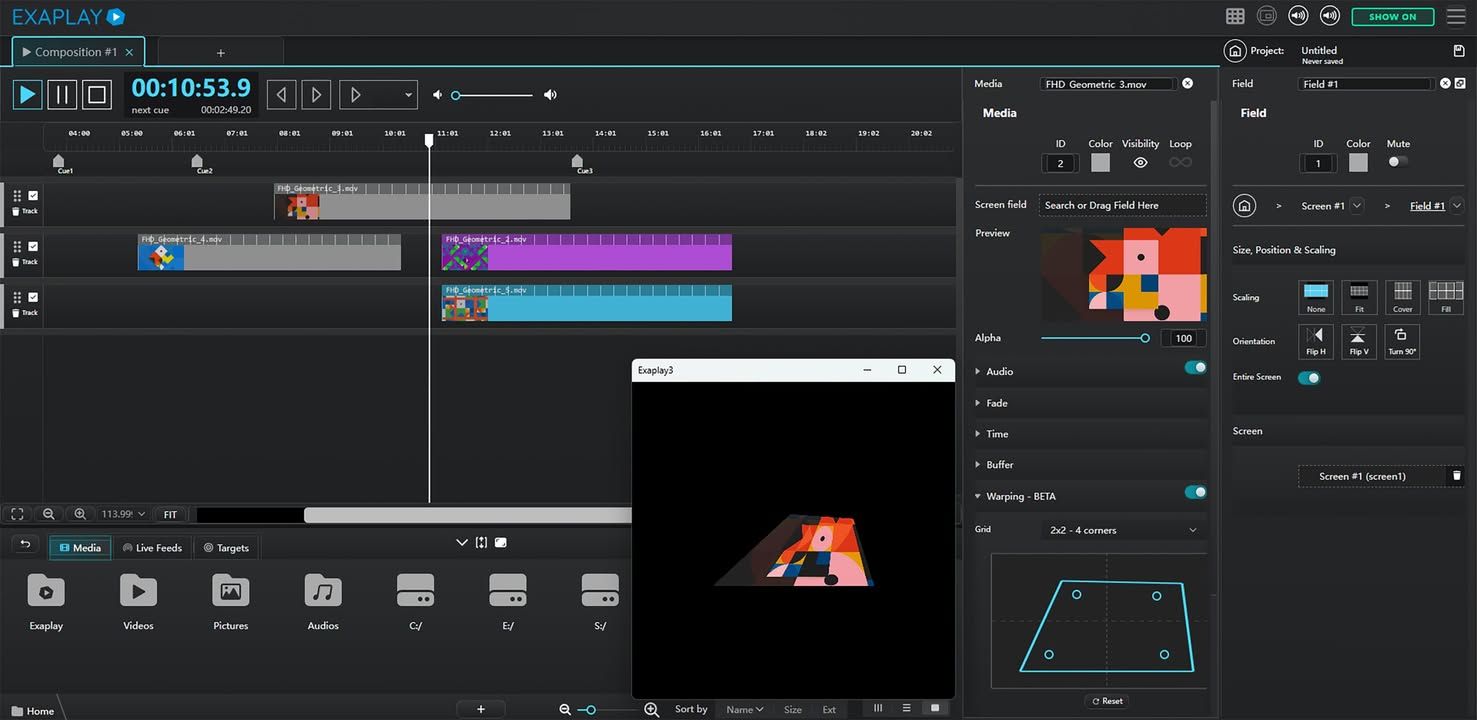 Straight forward software to run and arrange large format content, including HAP and NotchLC playback. Supports multiple displays and timelines as a headless system and loads VIOSO warp and blend data. Offers show control and is perfect for fixed installations.