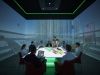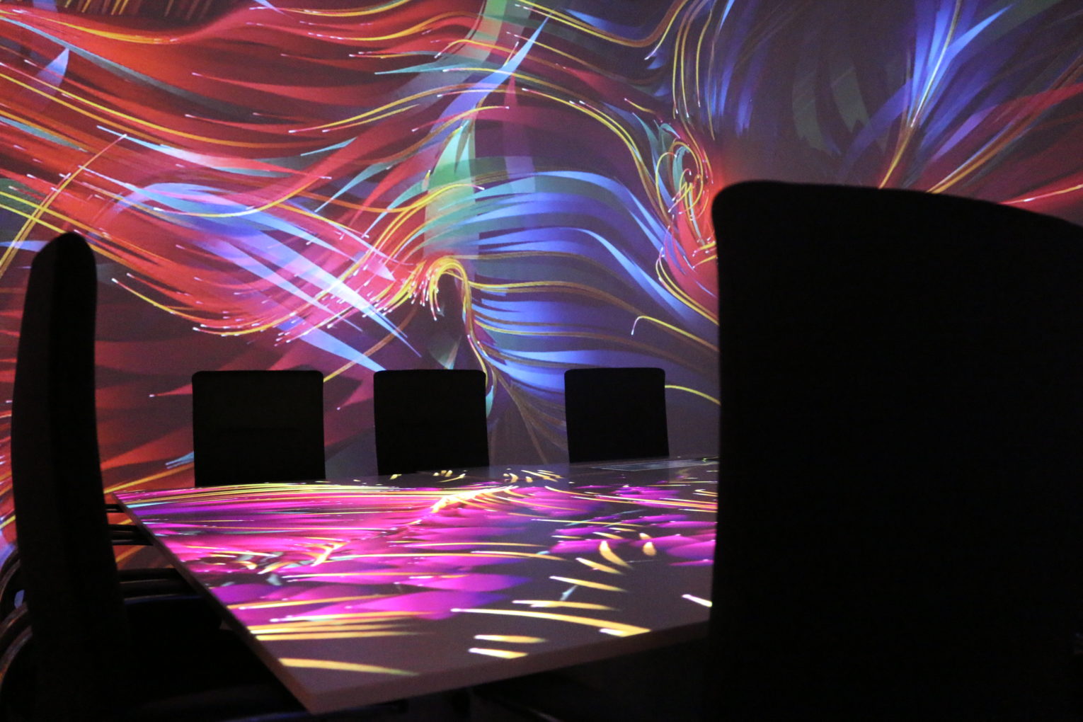 To fulfill this comprehensive plan, our partner Viscon GmbH installed 4x Barco F50 WQXGA for the walls and a Panasonic RZ 570 for the table projection. We added 5 Anystation Performer server and the software Wings VIOSO to bring the room to life.