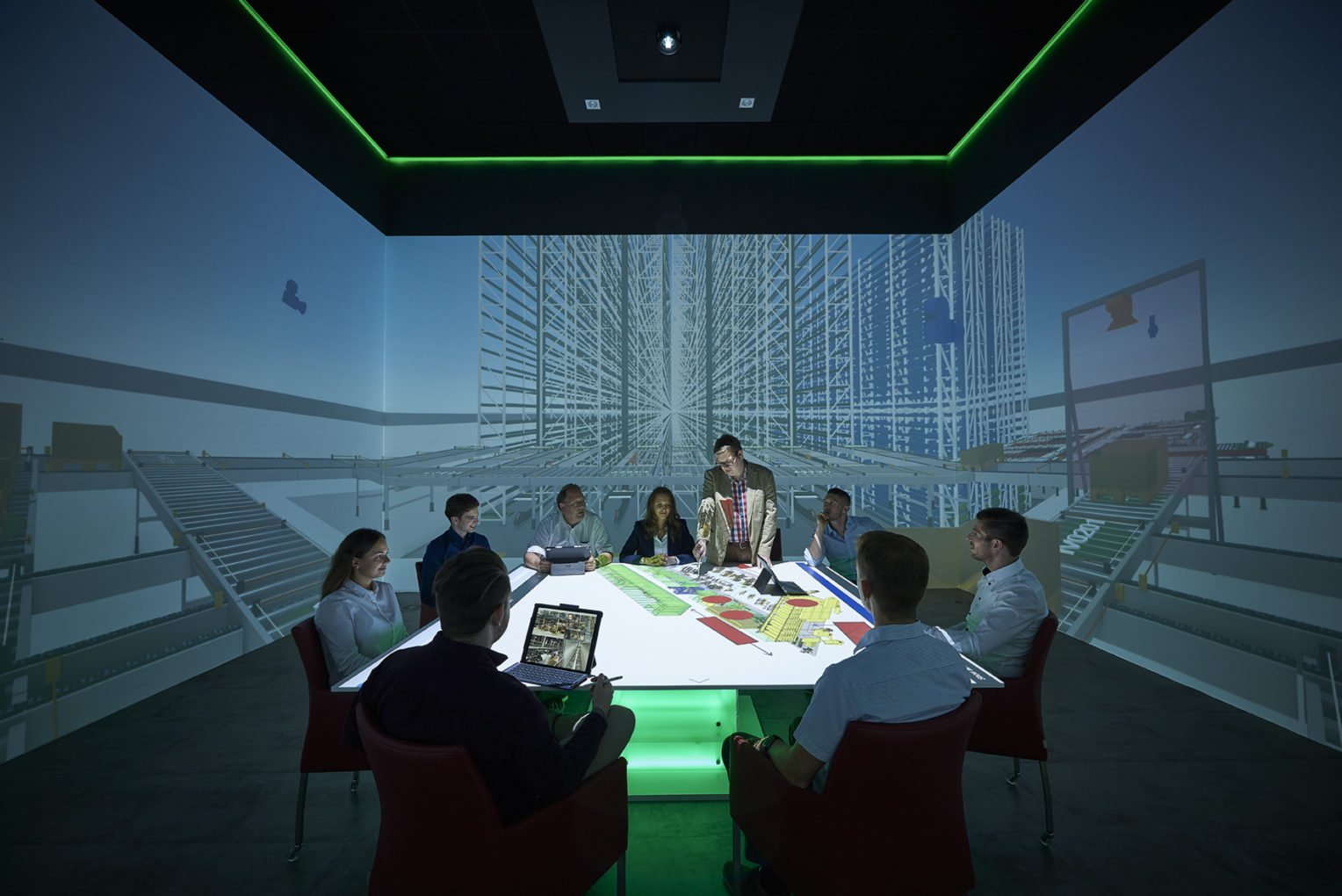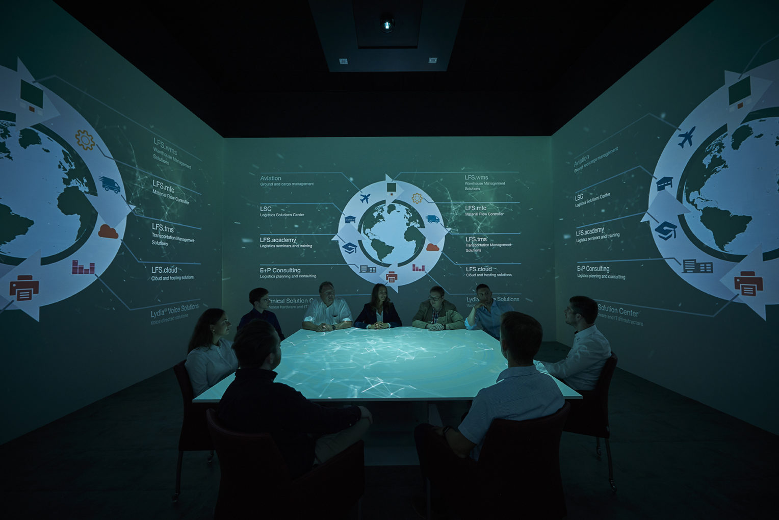 Ehrhardt Partner Groups Holodeck is a VR Cave solution to support their complex logistics planning and consulting. Customers can have a shared experience of their services without using VR glasses.