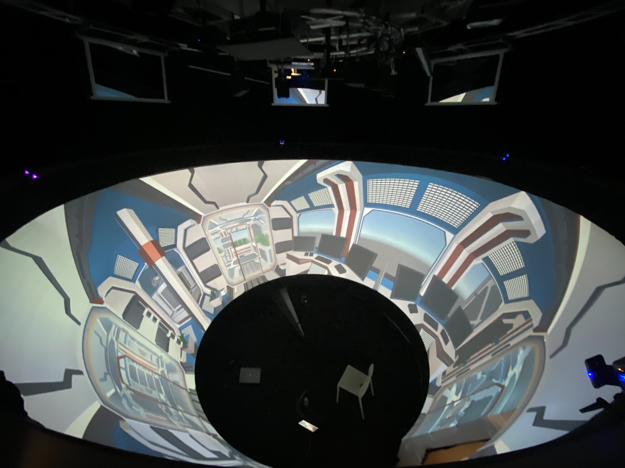 Manoeuvre simulators are the most demanding in terms of visualisation, where achieving both accuracy and realism presents significant challenges. Projection onto a panoramic screen surrounding the bridge is the solution that best meets these requirements. The screen, consisting of a PVC canvas stretched over an aluminium structure, measures 16 metres in diameter and is 6 metres high.