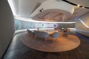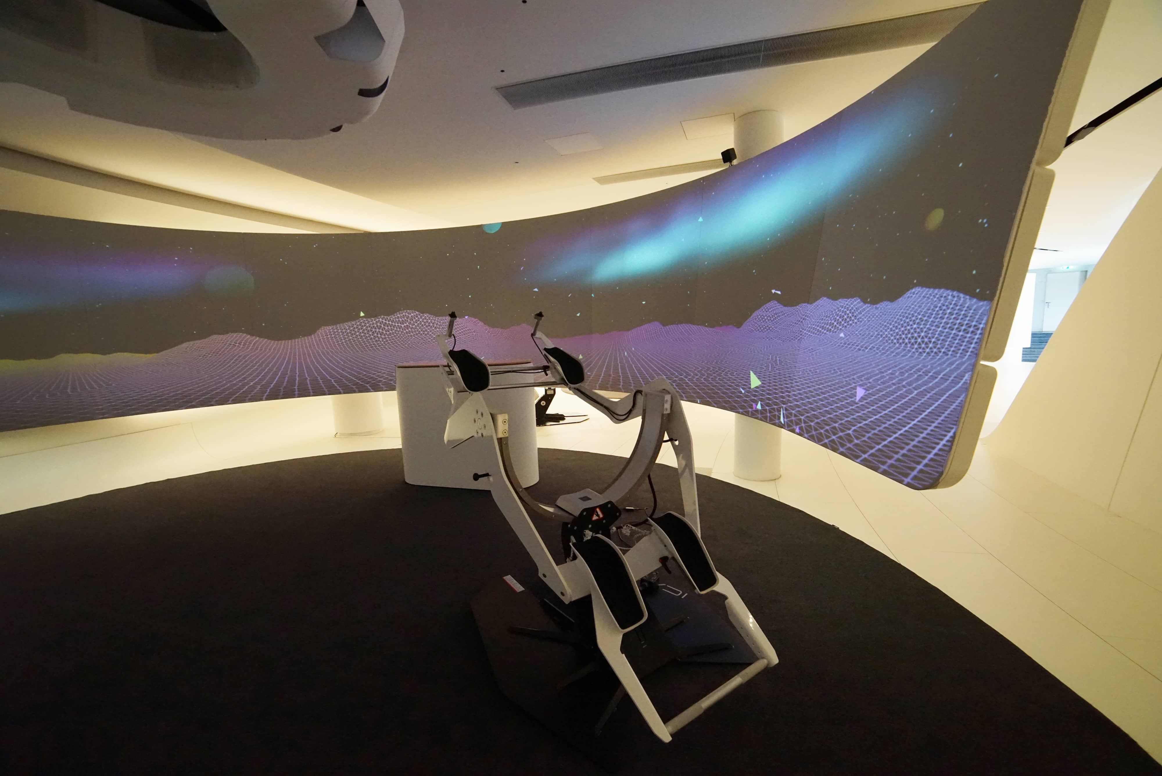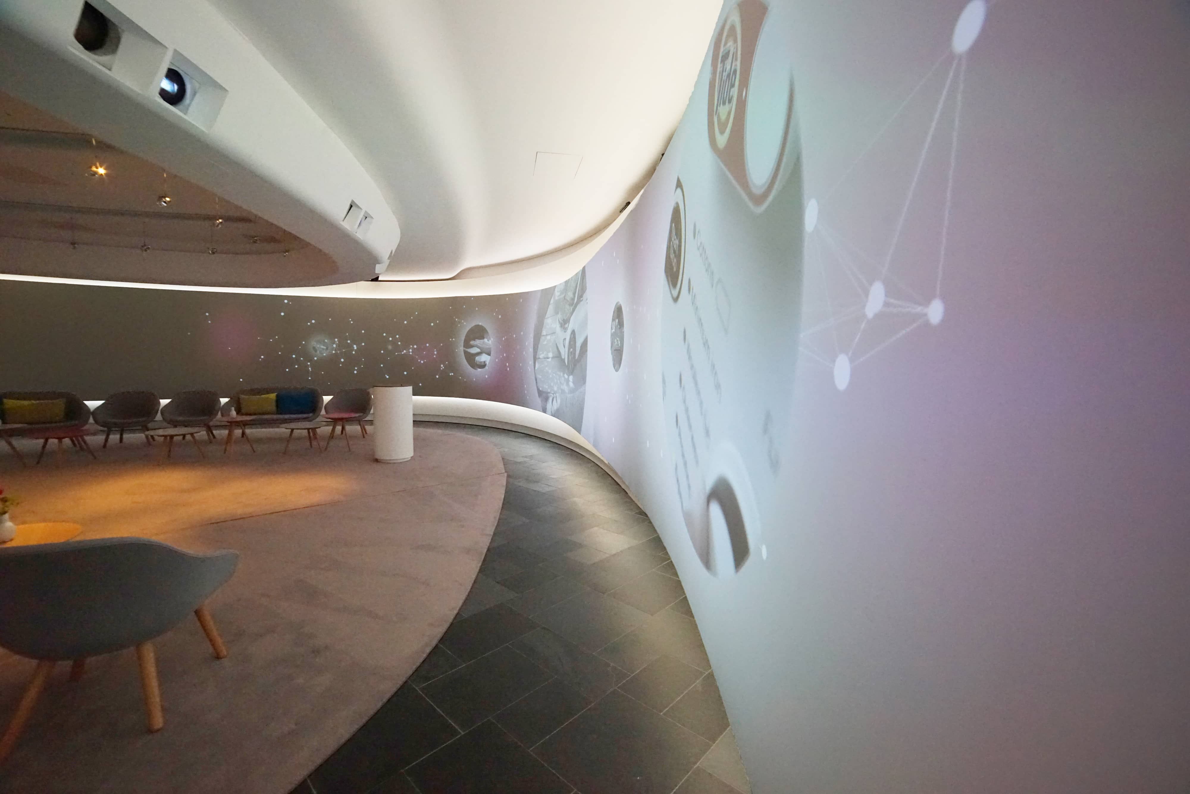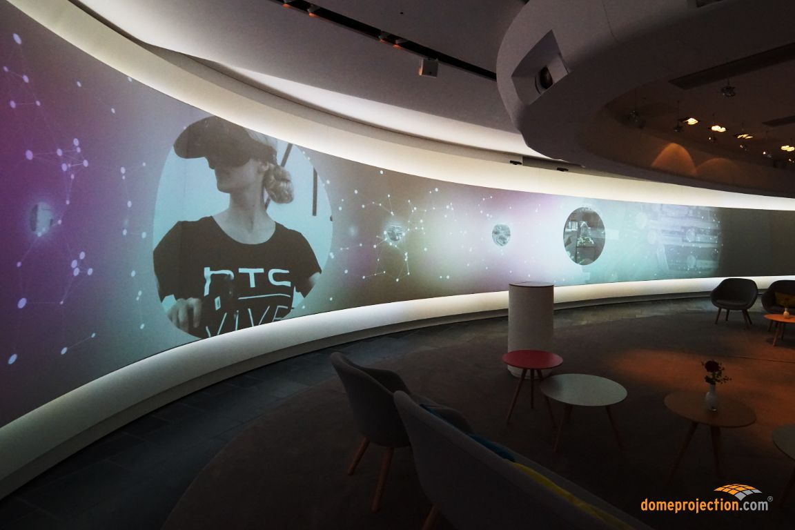 domeprojection.com was contracted in 2017 to install their AutoAlignment system to a narrow, spline curved screen projection in a meeting point scenario. A main requirement of the projection was an unobtrusive alignment system, that is invisible during normal use of the exhibition. Therefore we developed a set of magnetically attachable retro reflective spherical markers, which can be mounted and detached easily to the projection area. The detachable calibration camera is mounted on a special rotation unit at the ceiling.