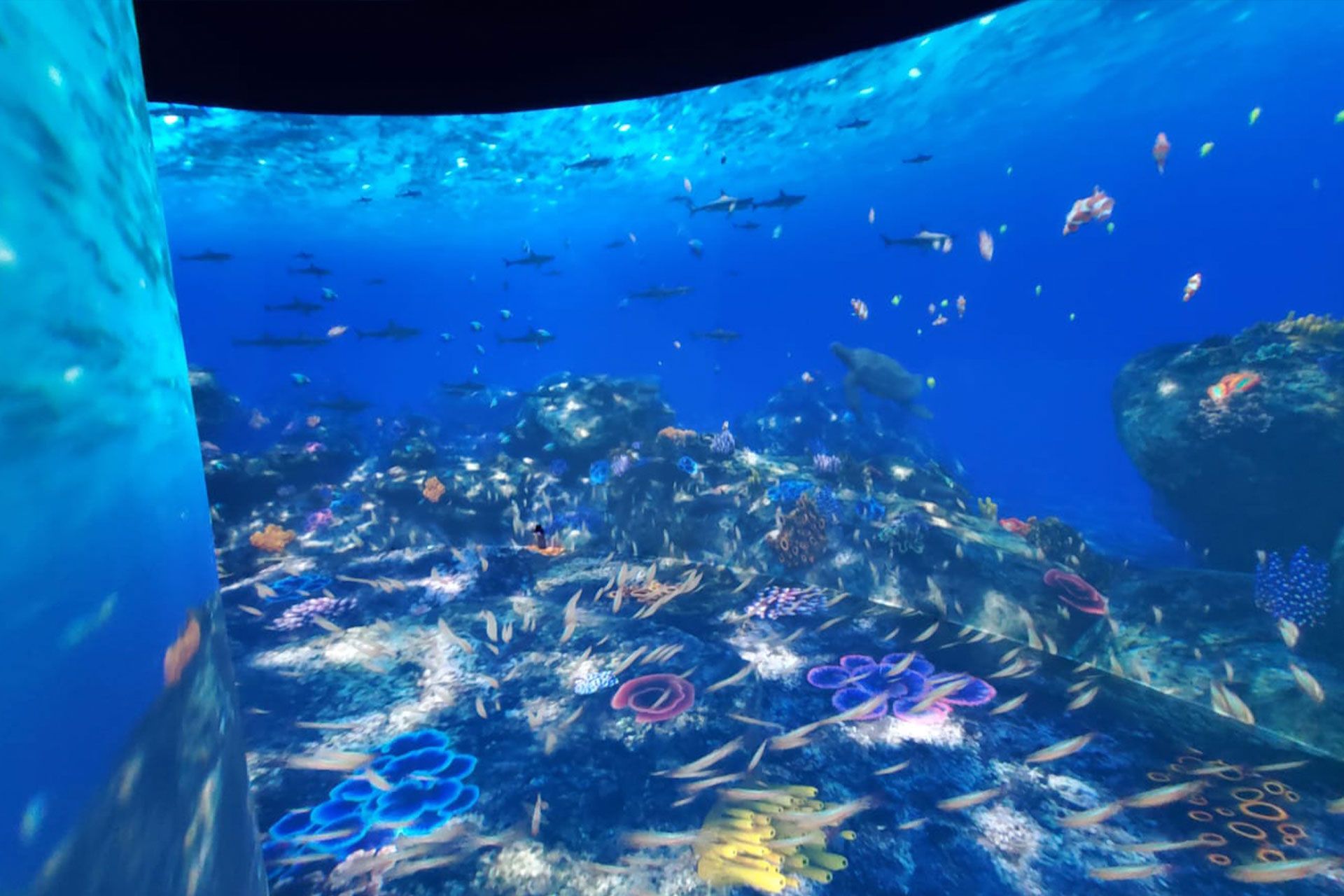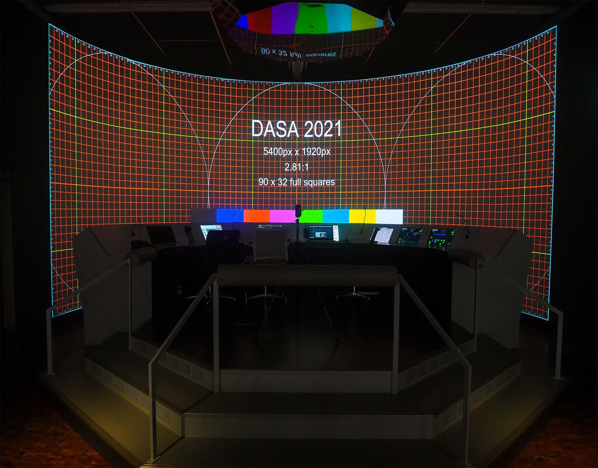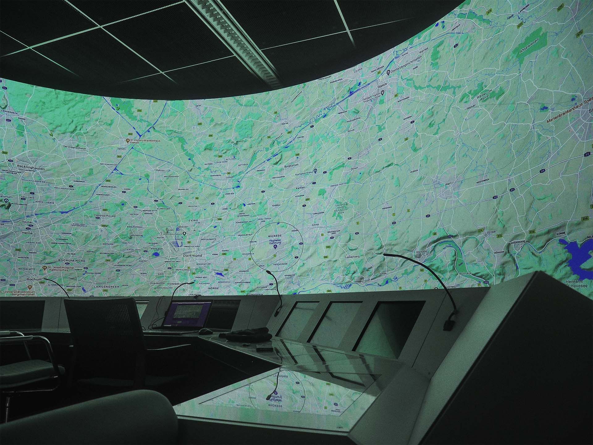 The installation consists of 5 projectors covering a 180° cylindrycal screen and powered by several media stations synchorinzed in real-time. We calibrated the system using VIOSO Anyblend VR & SIM, and we integrated the result into: Prepar3D v5 for Flight Simulation (using our Warp&Blend Plugin), and VIOSO Player for video and web-stream playback. The setup is remotely controlled with touch interfaces and programmed to an autonoumous schedule .