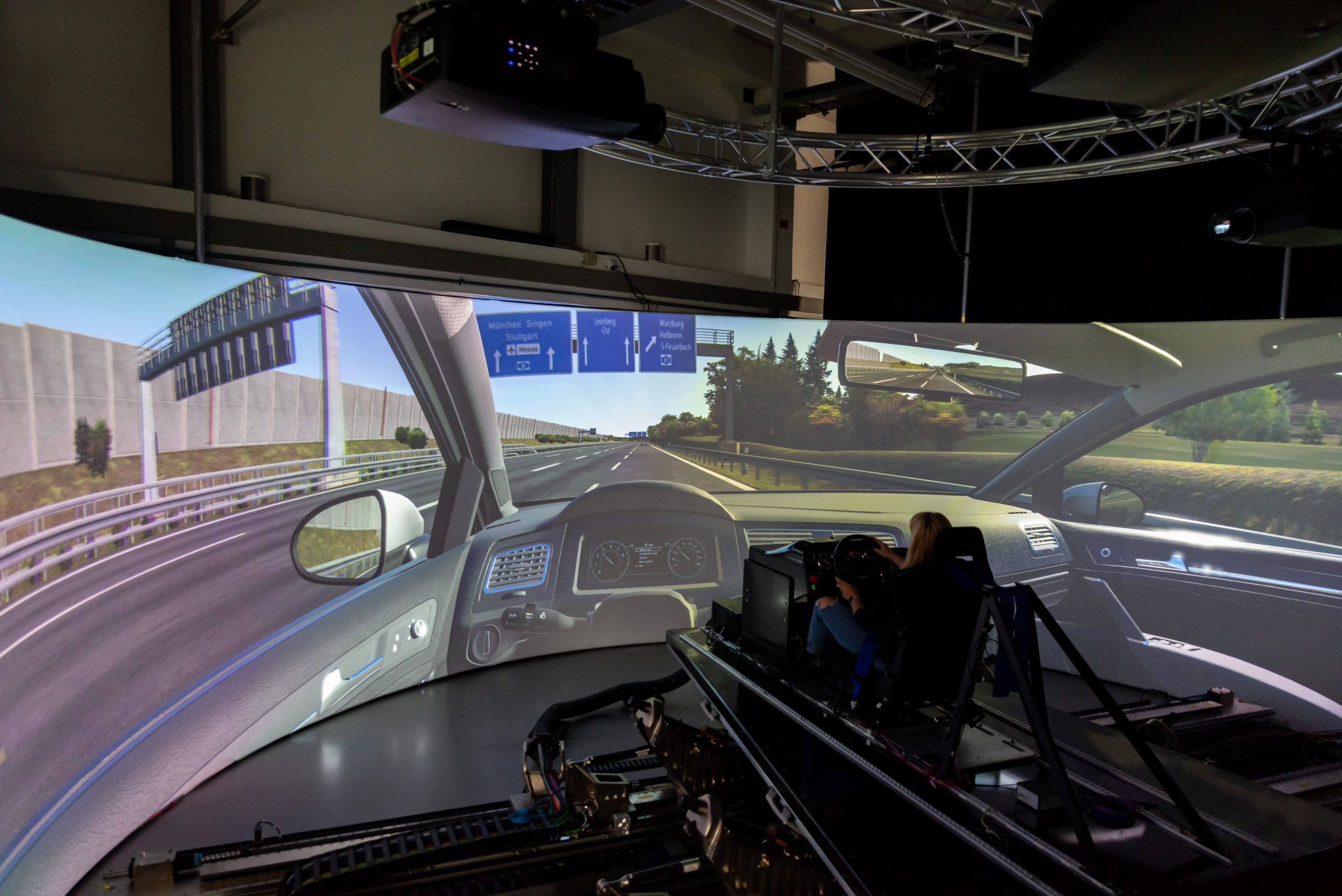 The display system for the driving simulator at the research institute Adrive Living Lab of the University of Applied Sciences Kempten consists of 4 channels warped and blended automatically with our VIOSO technology to create an immersive panoramic projection.