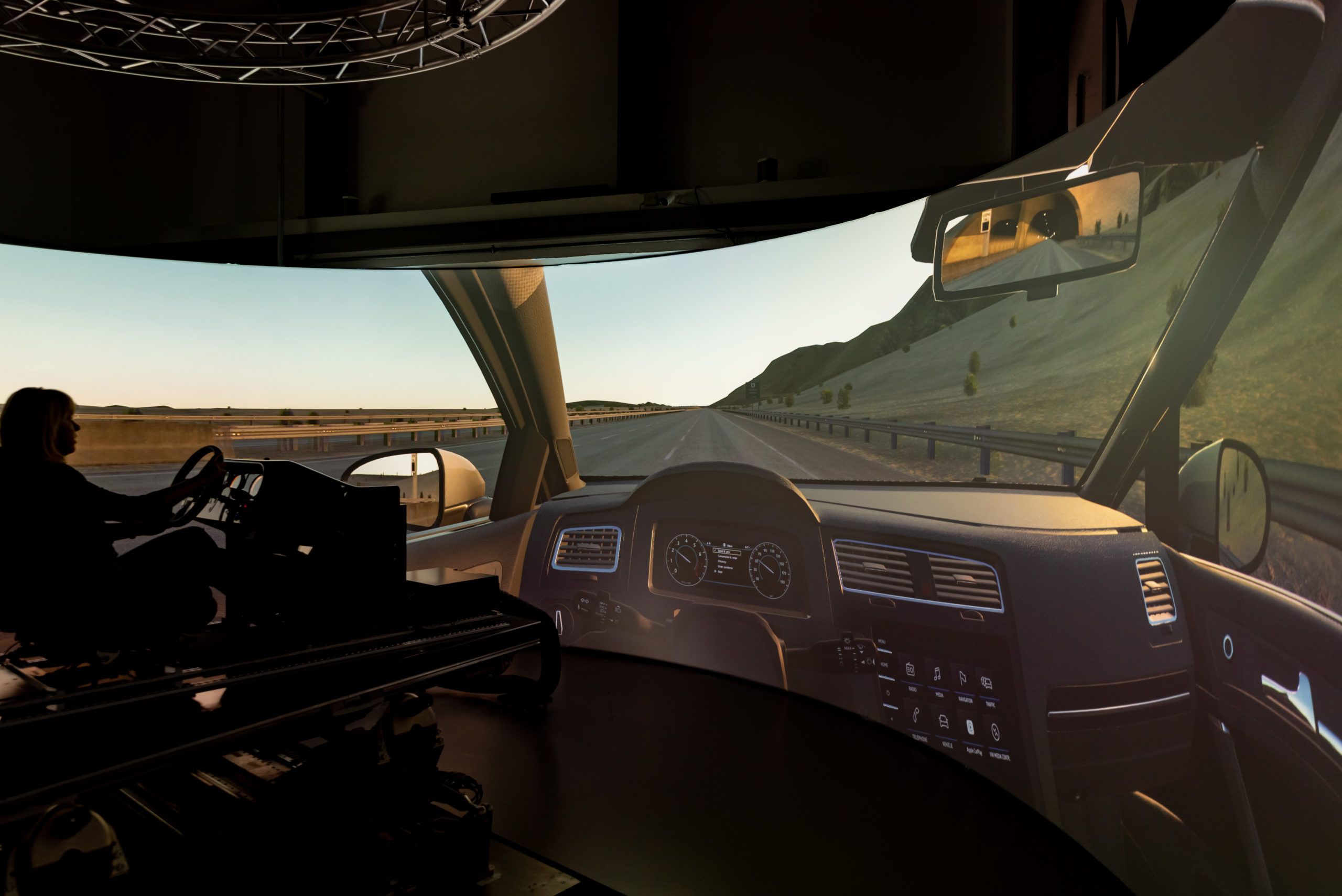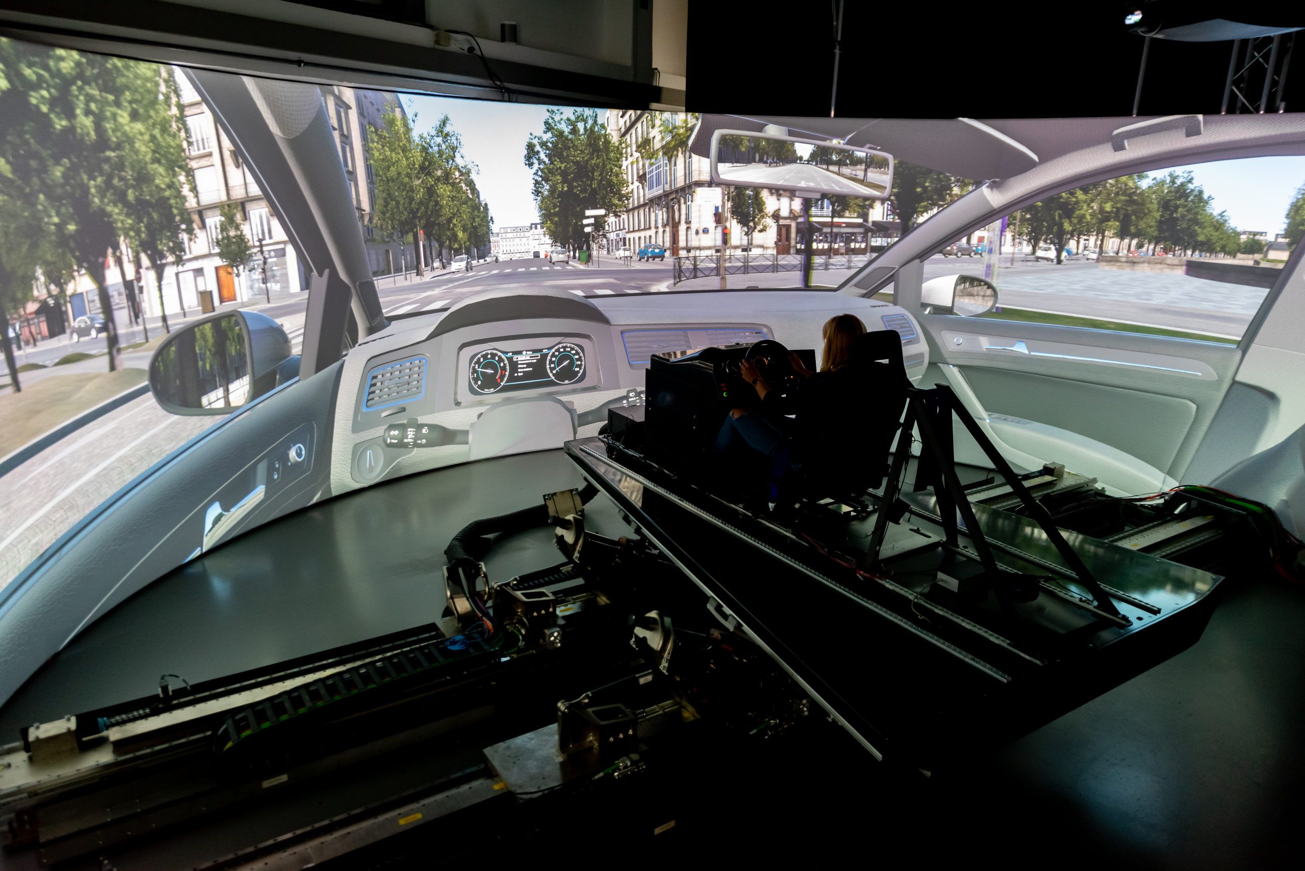 The simulator has several research and testing purproses in ergonomics (motion sickness, HMI, handover behavior, …) and in driving assistance systems (parametrization for guidance, steering assistance, …). It is also used for trainings of safety drivers for autonomous vehicles.