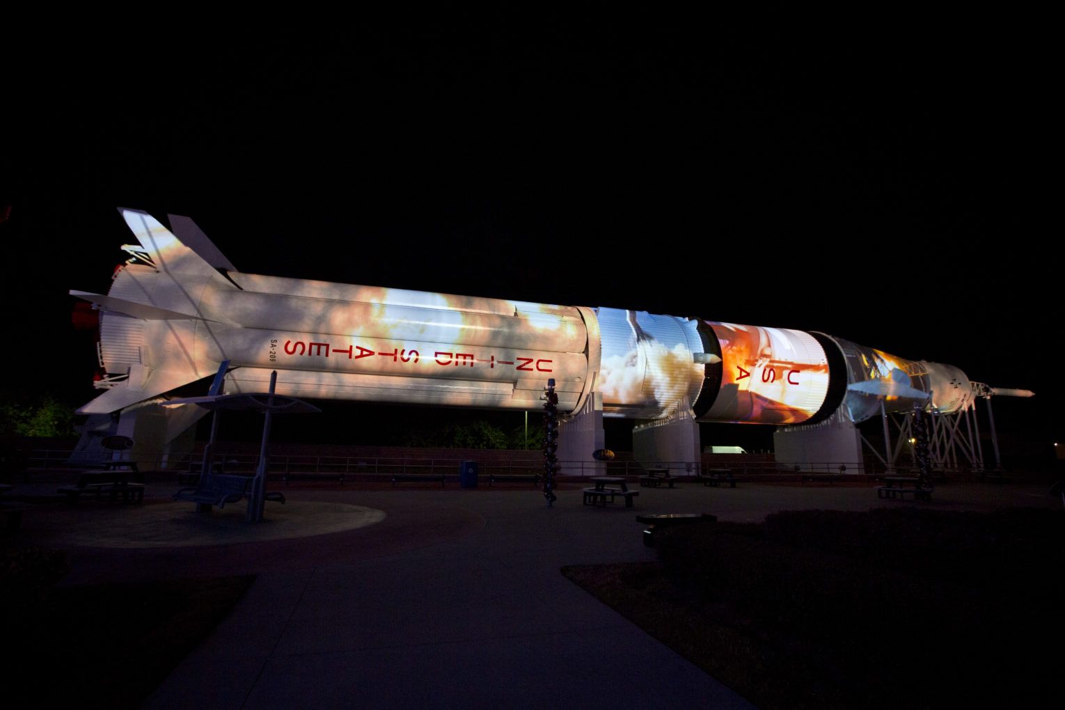 Originally commissioned by NASA for the Apollo program, the 223-foot long Saturn 1B rocket located in the open air Rocket Garden was transformed into a giant projection surface comprising an eye-capturing 6,528 by 1,050-pixel image that used 80,000 lumens of projected light. Visuals were accompanied by a dramatic musical score, actual launch audio, and other sound effects, in conjunction with a “Rocket Garden Light Show” that uses moveable lights to illuminate rockets throughout the Rocket Garden, complete the immersive sensory experience. For the first time, the VIOSO calibration process was integrated into the show as projectors needed to be calibrated prior to the first presentation. As the VIOSO calibration commenced, the audience believed that the rocket was being ‘scanned’ prior to launch of the holiday show.