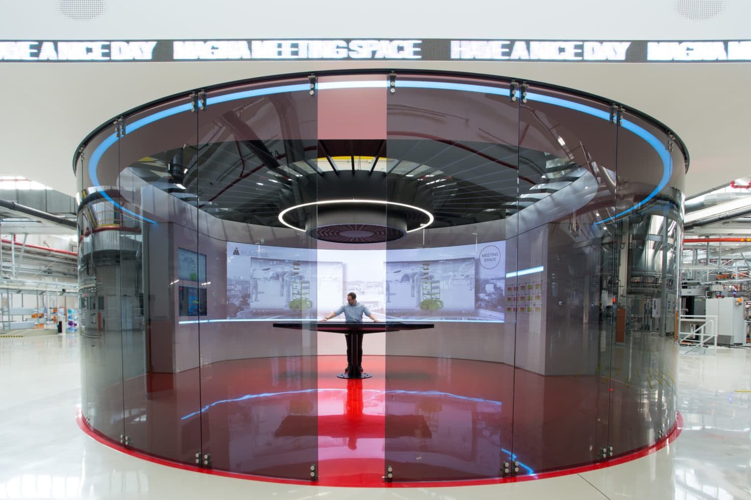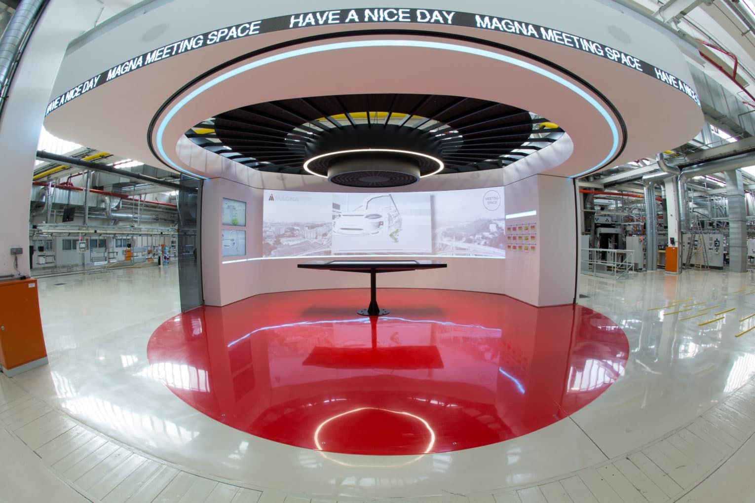 MAGNA Meeting Space impresses with a panorama projection made out of three Digital Projection EVISION LASER 6500 projectors, two built-in displays, an 84″ touchscreen table configured as a user interface & a Barco Clickshare system.